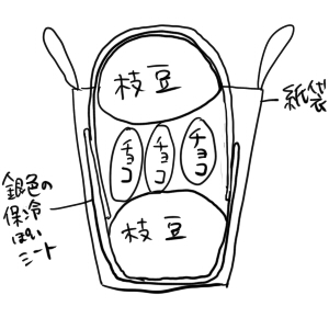 あると思ったのに当日朝見たら保冷剤が無かったので冷凍枝豆を代用しました。