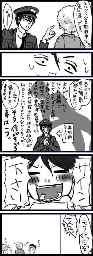 過去ここまで描くのが面倒臭い服ってあっただろうか・・と思いつつ頑張りました。警官土方カッコいいから頑張った。沖田の服もちゃんとメンズタマゴで調べました。