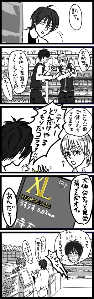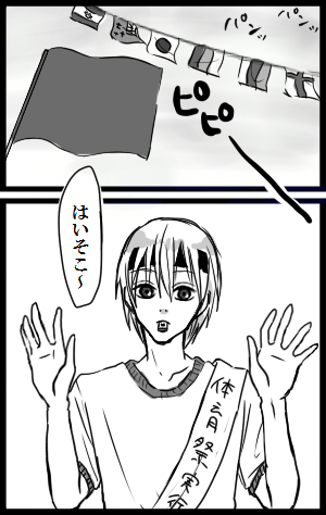 なにぶんこのサイト沖土以外が基本ドノーマルなのでイマイチ総悟も威嚇しがいがないという・・ちなみに二人三脚の相手は一応新パチです。初めて描きました新パチ・・初新パチがあんなんで新パチにも申し訳ない