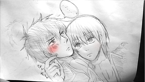 というわけで画像は節電中で日が暮れたら電気は豆電球までしかつけないようにしてるから明るいうちに必死で描いた沖土です! ちなみにちょんちょんやってるのは総悟の手です
