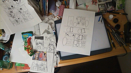 こんな感じで、相変わらずクソ汚い机の上で1日必ず1ページ。描いてます。