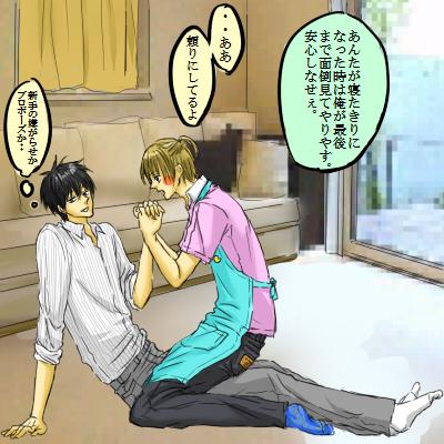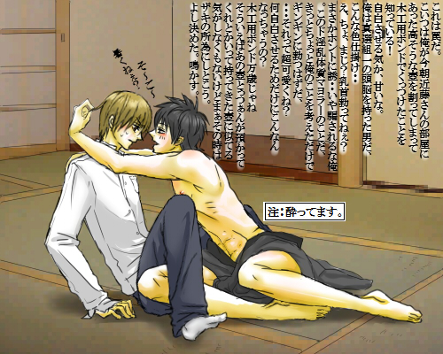 いきなり部屋に入ってくるなり脱ぎ始めた土方にS王子も目が点・・。ハッと我に返って、上の絵になる。